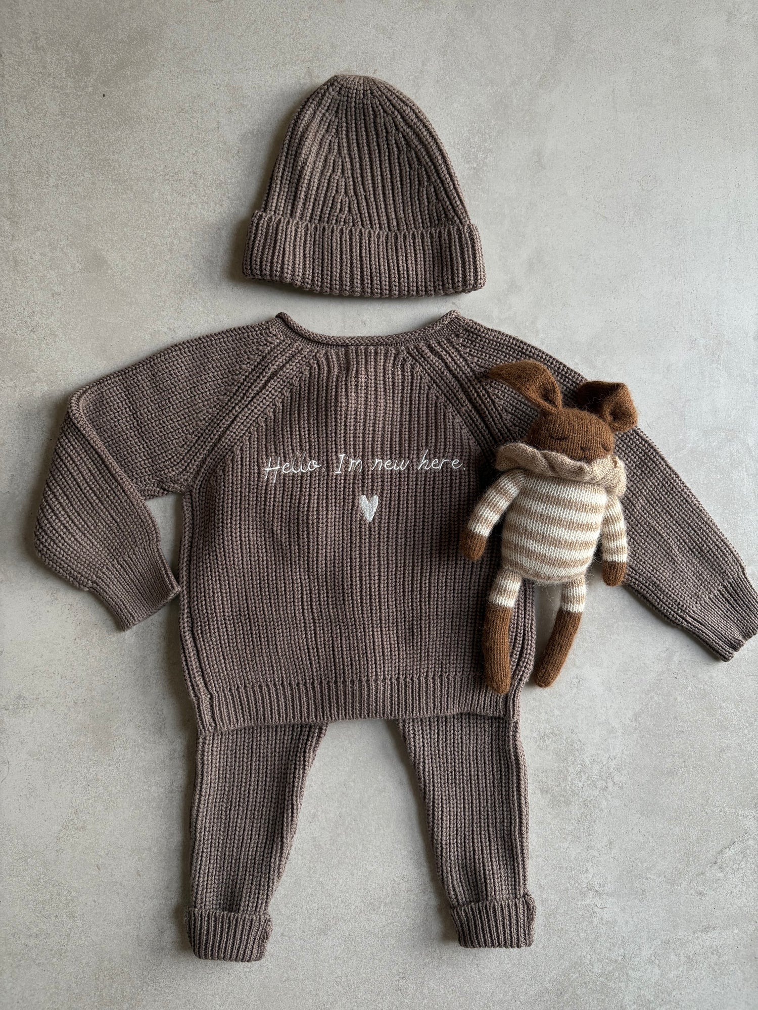 Unser liebevoll gestricktes Home-Coming-Set für Neugeborene ist das perfekte Outfit für den allerersten großen Moment – das Nachhausekommen.